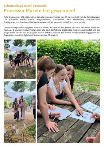 ProzessorMarvinhatgewonnen!AchtGruppender1AK,1BKund1AHWILstartetenamFreitag,den27.Junium8.30mitderSchnitzeljagd.DieStationenwaren:Schule,Pregartenteich,Mittelschule,Park,Hexenh%u00e4usl,Zemannstra%u00dfe,StadtgrabenundBrauhaus.DasWetterspieltemit,eswarnichtzuhei%u00dfundnichtzukalt.AbwechslungsreicheAufgabenwarenzul%u00f6sen,diesowohldenK%u00f6rperalsauchdenGeistforderten.Nachca.3StundenversammeltensichallebeimBuffet,dieErgebnissewurdenausgewertetundderSiegerstandfest:EswardieGruppeausder1AHWL,diesichdenNamenProezssorMarvingegebenhat.Gratulation,von80m%u00f6glichenPunktenwurden76erreicht.SchnitzeljagddurchFreistadt.