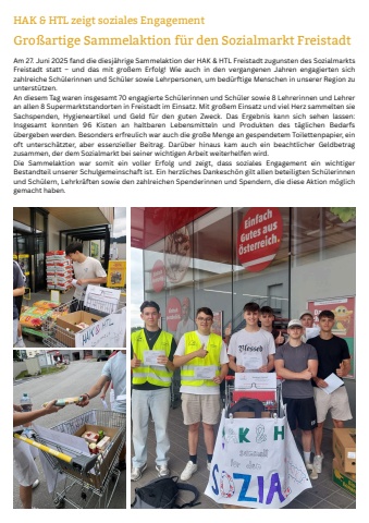 Gro%u00dfartigeSammelaktionf%u00fcrdenSozialmarktFreistadtAm27.Juni2025fanddiediesj%u00e4hrigeSammelaktionderHAK&HTLFreistadtzugunstendesSozialmarktsFreistadtstatt%u2013unddasmitgro%u00dfemErfolg!WieauchindenvergangenenJahrenengagiertensichzahlreicheSch%u00fclerinnenundSch%u00fclersowieLehrpersonen,umbed%u00fcrftigeMenscheninunsererRegionzuunterst%u00fctzen.AndiesemTagwareninsgesamt70engagierteSch%u00fclerinnenundSch%u00fclersowie8LehrerinnenundLehreranallen8SupermarktstandorteninFreistadtimEinsatz.Mitgro%u00dfemEinsatzundvielHerzsammeltensieSachspenden,HygieneartikelundGeldf%u00fcrdengutenZweck.DasErgebniskannsichsehenlassen:nsgesamtkonnten96KistenanhaltbarenLebensmittelnundProduktendest%u00e4glichenBedarfs%u00fcbergebenwerden.Besonderserfreulichwarauchdiegro%u00dfeMengeangespendetemToilettenpapier,einoftuntersch%u00e4tzter,aberessenziellerBeitrag.Dar%u00fcberhinauskamaucheinbeachtlicherGeldbetragzusammen,derdemSozialmarktbeiseinerwichtigenArbeitweiterhelfenwird.DieSammelaktionwarsomiteinvollerErfolgundzeigt,dasssozialesEngagementeinwichtigerBestandteilunsererSchulgemeinschaftist.EinherzlichesDankesch%u00f6ngiltallenbeteiligtenSch%u00fclerinnenundSch%u00fclern,Lehrkr%u00e4ftensowiedenzahlreichenSpenderinnenundSpendern,diedieseAktionm%u00f6glichgemachthaben.HAK&HTLzeigtsozialesEngagement