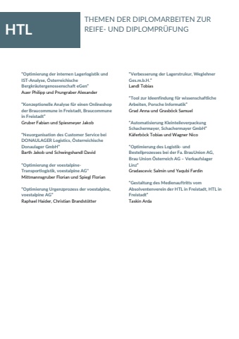 WissenswertesTHEMENDERDIPLOMARBEITENZURREIFE-UNDDIPLOMPR%u00dcFUNG%u201cOptimierungderinternenLagerlogistikundIST-Analyse,%u00d6sterreichischeBergkr%u00e4utergenossenschafteGen%u201dAuerPhilippundPrungraberAlexander%u201cKonzeptionelleAnalysef%u00fcreinenOnlineshopderBraucommuneinFreistadt,BraucommuneinFreistadt%u201dGruberFabianundSpiesmeyerJakob%u201cNeuorganisationdesCustomerServicebeiDONAULAGERLogistics,%u00d6sterreichischeDonaulagerGmbH%u201dBarthJakobundSchwingshandlDavid%u201cOptimierungdervoestalpine,Transportlogistik,voestalpineAG\MittmannsgruberFlorianundSpieg%u201cOptimierungUrgenzprozessdervoestalpinvoestalpineAG%u201dRaphaelHaider,ChristianBrandst%u00f6tter%u201cVerbesserungderLagerstrukur,WeglehnerGes.m.b.H.%u201dLandlTobias%u201cToolzurIdeenfindungf%u00fcrwissenschaftlicheArbeiten,PorscheInformatik%u201dGradAnnaundGrasb%u00f6ckSamuel%u201cAutomatisierungKleinteileverpackungSchachermayer,SchachermayerGmbH%u201dK%u00e4ferb%u00f6ckTobiasundWagnerNico%u201cOptimierungdesLogistik-undBestellprozessesbeiderFa.BrauUnionAG,BrauUnion%u00d6sterreichAG%u2013VerkaufslagerLinz%u201dGradascevicSalminundYaqubiFardin%u201cGestaltungdesMedienauftrittsvomAbsolventenvereinderHTLinFreistadt,HTFreistadt%u201dTaskinArdaHTL