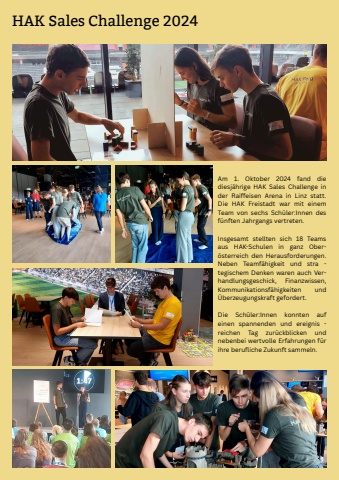 HAKSalesChallenge2024Am1.Oktober2024fanddiediesj%u00e4hrigeHAKSalesChallengeinderRaiffeisenArenainLinzstatt.DieHAKFreistadtwarmiteinemTeamvonsechsSch%u00fcler:Innendesf%u00fcnftenJahrgangsvertreten.nsgesamtstelltensich18TeamsausHAK-chuleninganzOber%u00f6sterreichdenHerausfordeungen.NebenTeamf%u00e4higkeitundstra-tegischemDenkenwarenauchVerhandlungsgeschick,Finanzwissen,Kommunikationsf%u00e4higkeitenund%u00dcberzeugungskraftgefordert.DieSch%u00fcler:nnenkonntenaufeinenspannendenundereignis-reichenTagzur%u00fcckblickenundnebenbeiwertvolleErfahrungenf%u00fcrihreberuflicheZukunftsammeln.