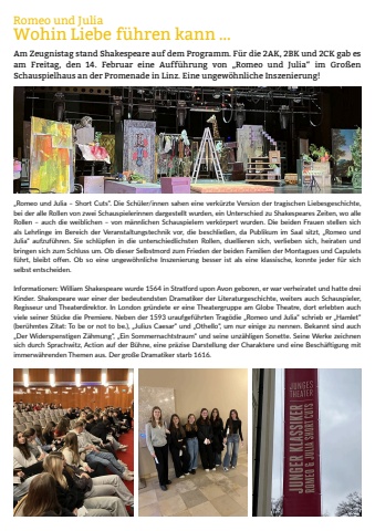 WohinLiebef%u00fchrenkann%u2026%u201eRomeoundJulia%u2013ShortCuts%u201c.DieSch%u00fcler/innensaheneineverk%u00fcrzteVersiondertragischenLiebesgeschichte,beideralleRollenvonzweiSchauspielerinnendargestelltwurden,einUnterschiedzuShakespearesZeiten,woalleRollen%u2013auchdieweiblichen%u2013vonm%u00e4nnlichenSchauspielernverk%u00f6rpertwurden.DiebeidenFrauenstellensichalsLehrlingeimBereichderVeranstaltungstechnikvor,diebeschlie%u00dfen,daPublikumimSaalsitzt,%u201eRomeoundJulia%u201caufzuf%u00fchren.Sieschl%u00fcpfenindieunterschiedlichstenRollen,duellierensich,verliebensich,heiratenundbringensichzumSchlussum.ObdieserSelbstmordzumFriedenderbeidenFamilienderMontaguesundCapuletsf%u00fchrt,bleibtoffen.Obsoeineungew%u00f6hnlicheInszenierungbesseristalseineklassische,konntejederf%u00fcrsichelbttcheidInformationen:WilliamShakespearewurde1564inStratforduponAvongeboren,erwarverheiratetundhattedreiKinder.ShakespearewareinerderbedeutendstenDramatikerderLiteraturgeschichte,weitersauchSchauspieler,RegisseurundTheaterdirektor.InLondongr%u00fcndeteereineTheatergruppeamGlobeTheatre,dorterlebtenauchvieleseinerSt%u00fcckediePremiere.Nebender1593uraufgef%u00fchrtenTrag%u00f6die%u201eRomeoundJulia%u201cschrieber%u201eHamlet%u201c(ber%u00fchmtesZitat:Tobeornottobe.),%u201eJuliusCaesar%u201cund%u201eOthello%u201c,umnureinigezunennen.Bekanntsindauch%u201eDerWiderspenstigenZ%u00e4hmung%u201c,%u201eEinSommernachtstraum%u201cundseineunz%u00e4hligenSonette.SeineWerkezeichnensichdurchSprachwitz,ActionaufderB%u00fchne,einepr%u00e4ziseDarstellungderCharaktereundeineBesch%u00e4ftigungmitimmerw%u00e4hrendenThemenaus.Dergro%u00dfeDramatikerstarb1616.AmZeugnistagstandShakespeareaufdemProgramm.F%u00fcrdie2AK,2BKund2CKgabesamFreitag,den14.FebruareineAuff%u00fchrungvon%u201eRomeoundJulia%u201cimGro%u00dfenSchauspielhausanderPromenadeinLinz.Eineungew%u00f6hnlicheInszenierung!RomeoundJulia