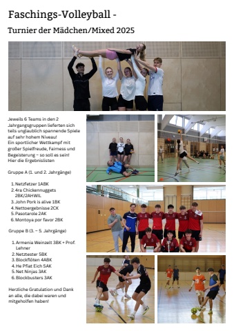 Faschings-Volleyball-Jeweils6Teamsinden2JahrgangsgruppenliefertensichteilsunglaublichspannendeSpieleaufsehrhohemNiveau!EinsportlicherWettkampfmitgro%u00dferSpielfreude,FairnessundBegeisterung%u2013sosollessein!HierdieErgebnislisten..1.Netzfetzer1ABK2.4raChickennuggets2BK/2AHWL3.JohnPorkisalive1BK4.Nettoergebnisse2CK5.Pasotarole2AK6.Montoyaporfavor2BKTurnierderM%u00e4dchen/Mixed2025GruppeB(3.5.Jahrg%u00e4nge)1.ArmeniaWeinzelt3BK+Prof.Lehner2.Netztester5BK3.Blockfl%u00f6ten4ABK4.HePfiatEich5AK5.NetNinjas3AK6.Blockbusters3AKHerzlicheGratulationundDankanalle,diedabeiwarenundmitgeholfenhaben!