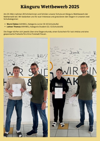 K%u00e4nguruWettbewerb2025Am20.M%u00e4rznahmen28Sch%u00fclerinnenundSch%u00fclerunsererSchuleamK%u00e4nguru-WettbewerbderMathematikteil.Wirbedankenunsf%u00fcreuerInteresseundgratulierendenSiegerninunserenzweiSchulkategorien:WurmFabian(1AHWL),KategorieJunior(9.-10.Schulstufe)LehnerThomas(4AHWIL),KategorieStudent(11.-13.Schulstufe)DieSiegerd%u00fcrfensichjeweils%u00fcbereineSiegerurkunde,einenGutscheinf%u00fcrIsa%u2019sImbissundeinegesponserteFreikartef%u00fcrsKinoFreistadtfreuen.