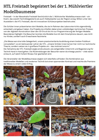 HTLFreistadtbegeistertbeider1.M%u00fchlviertlerModellbaumesseFreistadt%u2013InderMessehalleFreistadtfandk%u00fcrzlichdie1.M%u00fchlviertlerModellbaumessestatt%u2013einEvent,dassowohlTechnikbegeistertealsauchHobbybastlerausderRegionanzog.MittenunterdenAusstellern:dieHTLFreistadt,diemitinnovativenSch%u00fclerprojektenbeeindruckte.DieSch%u00fcler:innenpr%u00e4sentiertendortModelle,diesieimRahmendesLaborunterrichtseigenst%u00e4ndigentwickeltundgebauthaben.DieProjektedurchliefendabeieinenvollst%u00e4ndigentechnischenProzess:vonderdigitalenKonstruktion%u00fcberden3D-DruckbishinzurProgrammierungderfertigenModelle.BesonderesHighlight:DieBesucherkonntendieModellelivemitdemSmartphonesteuern,wasnichtnurKinder,sondernauchErwachsenefaszinierte.%u201eDieMessewareinetolleGelegenheit,unserepraxisorientierteAusbildungeinembreitenPublikumvorzustellen%u201c,soeinbetreuenderLehrerderHTL.%u201eUnsereSch%u00fcler:innenlernenhiernichtnurtechnischeTheorie,sondernsetzensieingreifbareProjekteumdasmotiviertenorm.%u201cDieTeilnahmederHTLFreistadtzeigteeindrucksvoll,wiezeitgem%u00e4%u00dferUnterrichtundBegeisterungf%u00fcrTechnikHandinHandgehen.DieR%u00fcckmeldungenderBesucherwarendurchwegspositivvielewarenerstaunt,aufwelchhohemNiveauhiergearbeitetwird.DieVeranstalterderModellbaumessezeigtensichebenfallszufrieden:DieKombinationaustraditionellenModellenundmodernerTechnikboteinenspannendenKontrastundmachtediePremierederMessezueinemvollenErfolg.