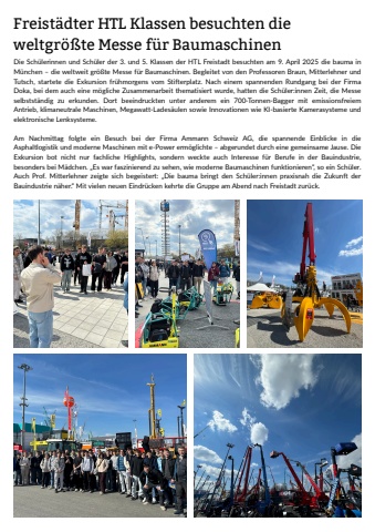 Freist%u00e4dterHTLKlassenbesuchtendieweltgr%u00f6%u00dfteMessef%u00fcrBaumaschinenDieSch%u00fclerinnenundSch%u00fclerder3.und5.KlassenderHTLFreistadtbesuchtenam9.April2025diebaumainM%u00fcnchen%u2013dieweltweitgr%u00f6%u00dfteMessef%u00fcrBaumaschinen.BegeitetvondenProfessorenBraun,MitterlehnerundTutsch,startetedieExkursionfr%u00fchmorgensvomStifterplatz.NacheinemspannendenRundgangbeiderFirmaDoka,beidemaucheinem%u00f6glicheZusammenarbeitthematisiertwurde,hattendieSch%u00fcler:innenZeit,dieMesseselbstst%u00e4ndigzuerkunden.Dortbeeindrucktenunteranderemein700-Tonnen-BaggermitemissionsfreiemAntrieb,klimaneutraleMaschinen,Megawatt-Lades%u00e4ulensowieInnovationenwieKI-basierteKamerasystemeundelektronischeLenksysteme.AmNachmittagfolgteeinBesuchbeiderFirmaAmmannSchweizAG,diespannendeEinblickeindieAsphaltlogistikundmoderneMaschinenmite-Powererm%u00f6glichte%u2013abgerundetdurcheinegemeinsameJause.DieExkursionbotnichtnurfachlicheHighlights,sondernweckteauchInteressef%u00fcrBerufeinderBauindustrie,besondersbeiM%u00e4dchen.%u201eEswarfaszinierendzusehen,wiemoderneBaumaschinenfunktionieren%u201c,soeinSch%u00fcler.AuchProf.Mitterlehnerzeigtesichbegeistert:%u201eDiebaumabringtdenSch%u00fcler:innenpraxisnahdieZukunftderBauindustrien%u00e4her.%u201cMitvielenneuenEindr%u00fcckenkehrtedieGruppeamAbendnachFreistadtzur%u00fcck.