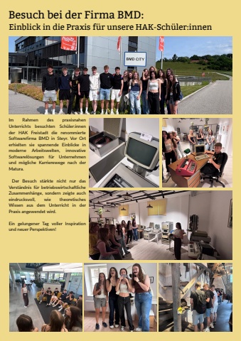 BesuchbeiderFirmaBMD:ImRahmendespraxisnahenUnterrichtsbesuchtenSch%u00fcler:innenderHAKFreistadtdierenommierteSoftwarefirmaBMDinSteyr.VorOrterhieltensiespannendeEinblickeinmoderneArbeitswelten,innovativeSoftwarel%u00f6sungenf%u00fcrUnternehmenundm%u00f6glicheKarrierewegenachderMatura.DerBesucsrenchnurasVerst%u00e4ndnisf%u00fcrbetriebswirtschaftcheZusammenh%u00e4nge,sondernzeigteaucheindrucksvoll,wietheoretischesWissenausdemUnterrichtinderPraxisangewendetwird.EingelungenerTagvollerInspirationundneuerPerspektiven!EinblickindiePraxisf%u00fcrunsereHAK-Sch%u00fcler:innen