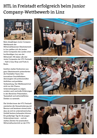 HTLinFreistadterfolgreichbeimJuniorCompany-WettbewerbinLinzBeimdiesj%u00e4hrigenJuniorCompanyWettbewerbderWirtschaftskammerOber%u00f6sterreichinLinzstelltensichdiebestenJuniorCompaniesdesLandeseinerhochkar%u00e4tigenJuryausderWirtschaft.Mitdabei:alledreiJuniorCompaniesderHTLFreistadt%u2013Nailit,EasyShopundFruits&Roots.InmittenstarkerKonkurrenzausganzOber%u00f6sterreichpr%u00e4sentiertedieFreist%u00e4dterTeamsihreinnovativenGesch%u00e4ftsideen,%u00fcberzeugtenmitprofessionellenAuftrittenundperfekterVorbereitung.DerWettbewerbbotnichtnurdieChance,Unternehmergeistzuzeigen,sondernauchwertvolleErfahrungenindenBereichenPr%u00e4sentation,TeamarbeitundwirtschaftlichesDenkenzusammeln.DieSch%u00fcler:innenderHTLFreistadtmeistertendieHerausforderungmitBravourundbewieseneinmalmehr,dasssiesichimunternehmerischenUmfeldbestensbehauptenk%u00f6nnen.Eingro%u00dfartigerTagf%u00fcrdiejungenUnternehmer:innen%u2013undeinstarkesZeichenf%u00fcrpraxisnahenWirtschaftsunterrichtanderHTL!