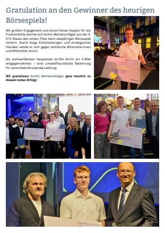 GratulationandenGewinnerdesheurigenB%u00f6rsespiels!Mitgro%u00dfemEngagementundeinemfeinenGesp%u00fcrf%u00fcrdieFinanzm%u00e4rktekonntesichArminMartetschl%u00e4gerausder4.HTLKlassedenerstenPlatzbeimdiesj%u00e4hrigenB%u00f6rsespielsichern.DurchklugeEntscheidungenundstrategischesHandelnsetzteersichgegenzahlreicheMitstreiterinnenundMitstreiterdurch.AlswohlverdientenHauptpreisdurfteArmineinEBikeentgegennehmeneineumweltfreundlicheBelohnungf%u00fcrseinebeeindruckendeLeistung.WirgratulierenArminMartetschl%u00e4gerganzherzlichzudiesemtollenErfolg!