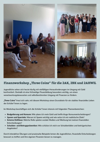 Jugendlichesehensichheuteh%u00e4ufigmitvielf%u00e4ltigenHerausforderungenimUmgangmitGeldkonfrontiert.Deshalbisteinefr%u00fchzeitigeFinanzbildungbesonderswichtig,umeinenverantwortungsbewusstenundselbstbestimmtenUmgangmitFinanzenzuf%u00f6rdern.%u201eThreeCoins%u201cfreutsichsehr,mitdiesemWorkshopeinenGrundsteinf%u00fcreinstabilesfinanziellesLebenderSch%u00fcler*innenzulegen.ImWorkshopbesch%u00e4ftigensichdieSch%u00fcler*innenintensivmitfolgendenThemenbereichen:BudgetierungundKonsum:WieplaneichmeinGeldundtreffeklugeKonsumentscheidungen?SparenundSparziele:WarumistSparenwichtigundwiesetzeichmirrealistischeZiele?ExterneEinfl%u00fcsse:WelcheRollespielensozialeMedienundWerbungbeimeinenfinanziellenEntscheidungen?Schulden-undBetrugspr%u00e4vention:Wiesch%u00fctzeichmichvorSchuldenfallenundbetr%u00fcgerischenAngeboten?Durchinteraktive%u00dcbungenundpraxisnaheBeispielelernendieJugendlichen,finanzielleEntscheidungenbewusstzutreffenundihreeigenenFinanzenbesserzumanagen.